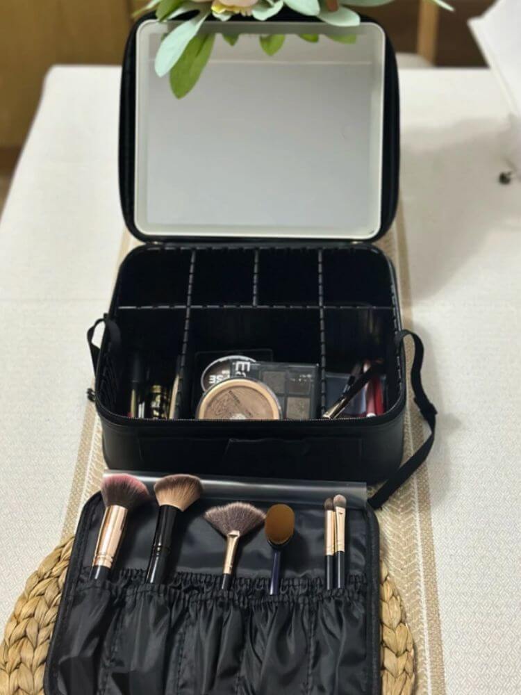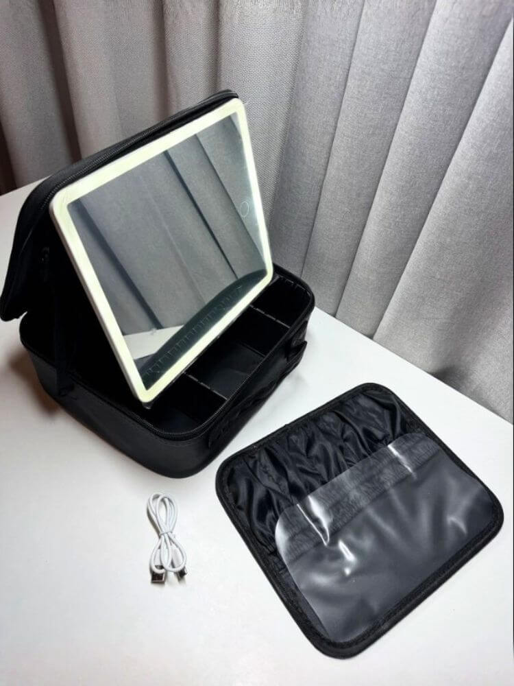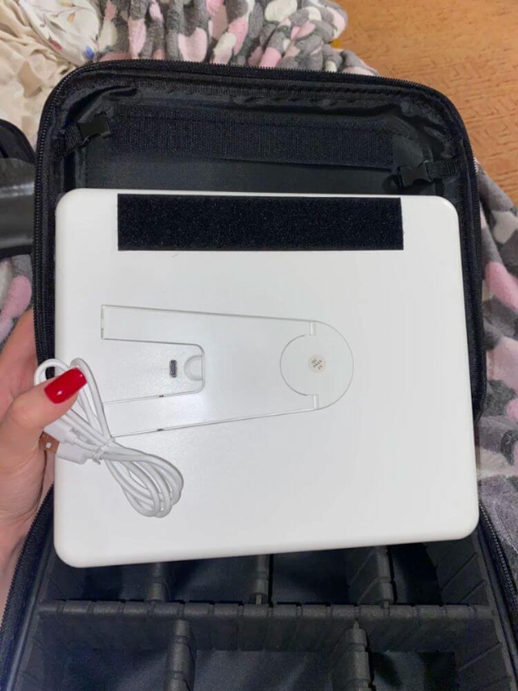 Косметичка продумана до мелочей. Зеркало легко снимается и имеет подставку - его можно размещать в удобном для Вас месте. Больше не нужно искать хороший свет для нанесения макияжа - качественное освещенеи всегда с Вами.