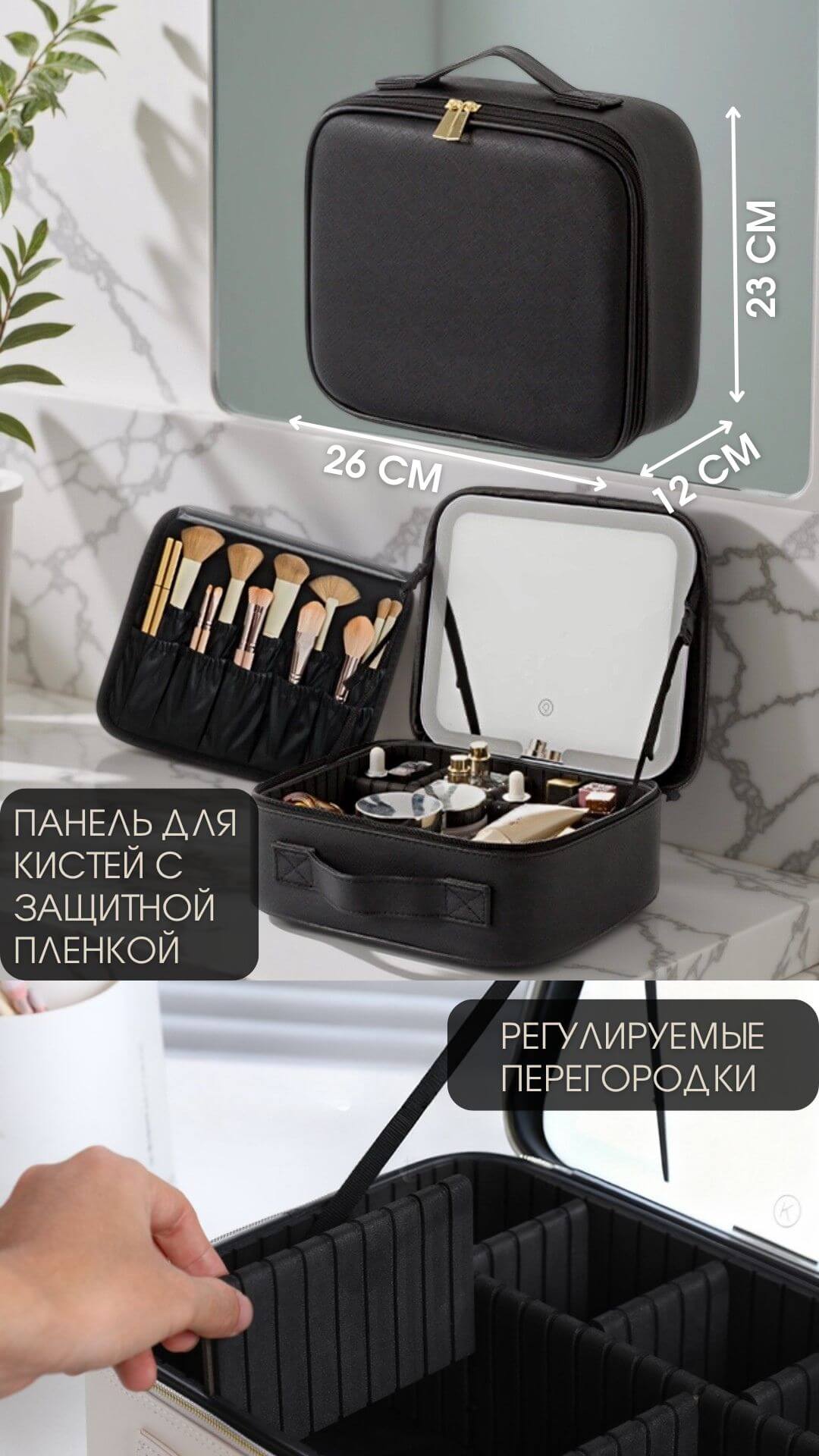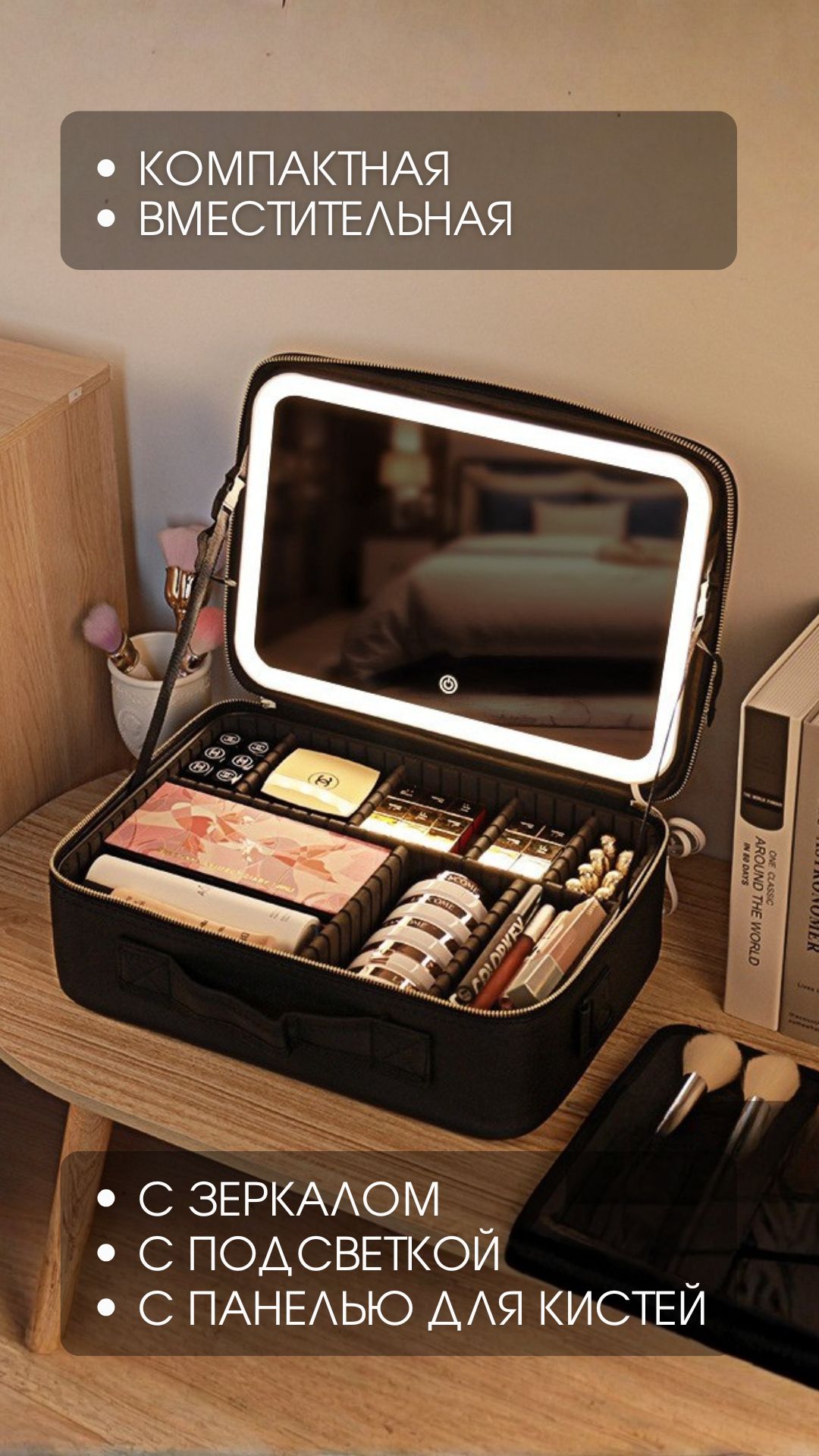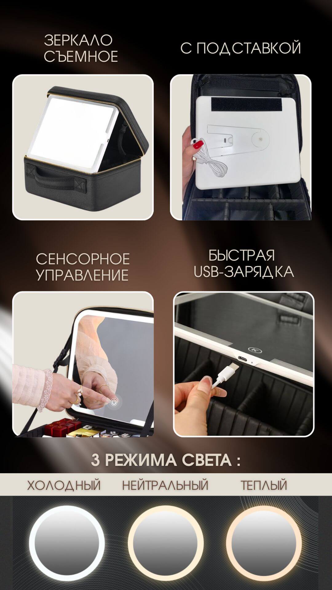 Мобильный и удобный органайзер для косметики имеет жесткий каркас, ручку для переноски, съемное зеркало с 3-мя режимамаи подсветки и сенсорным управлением. Подходит для хранения косметики и нанесения макияжа дома, в дороге, в гостиннице, на работе. Ваш туалетный столик теперь будет всегда с Вами.