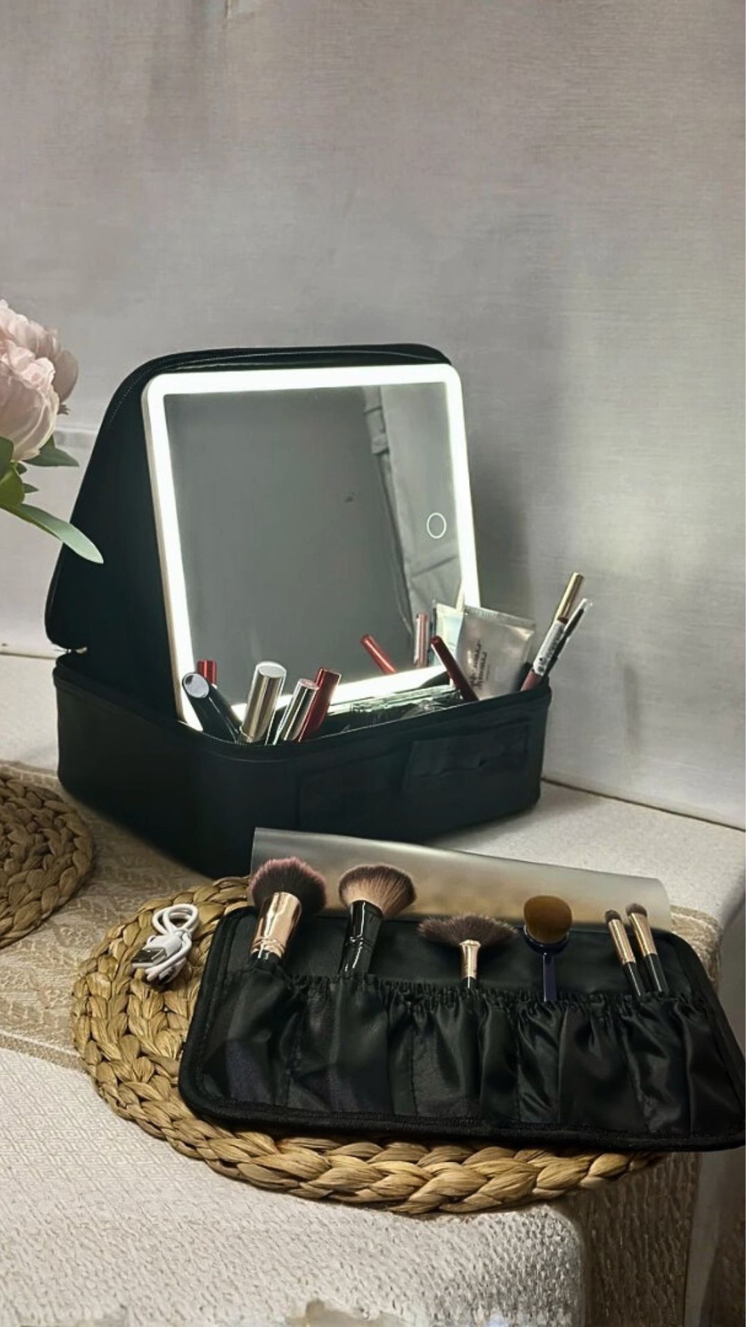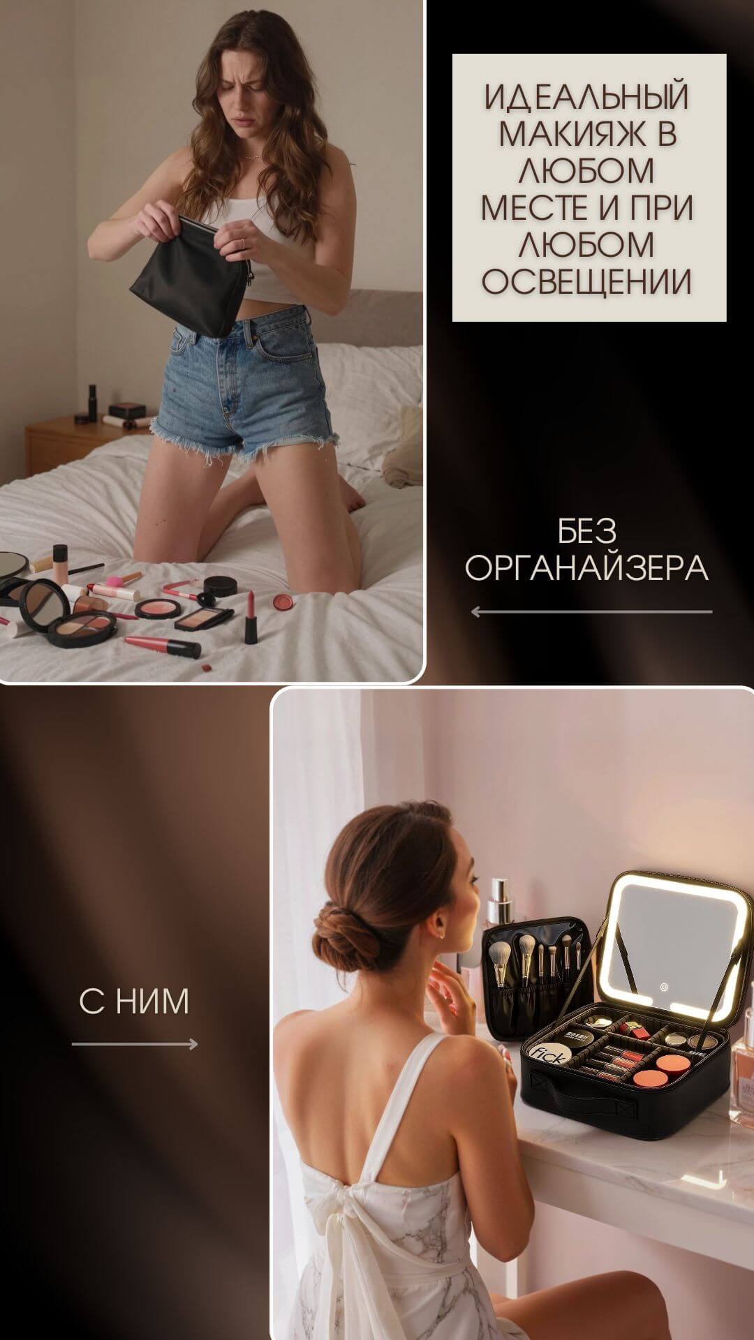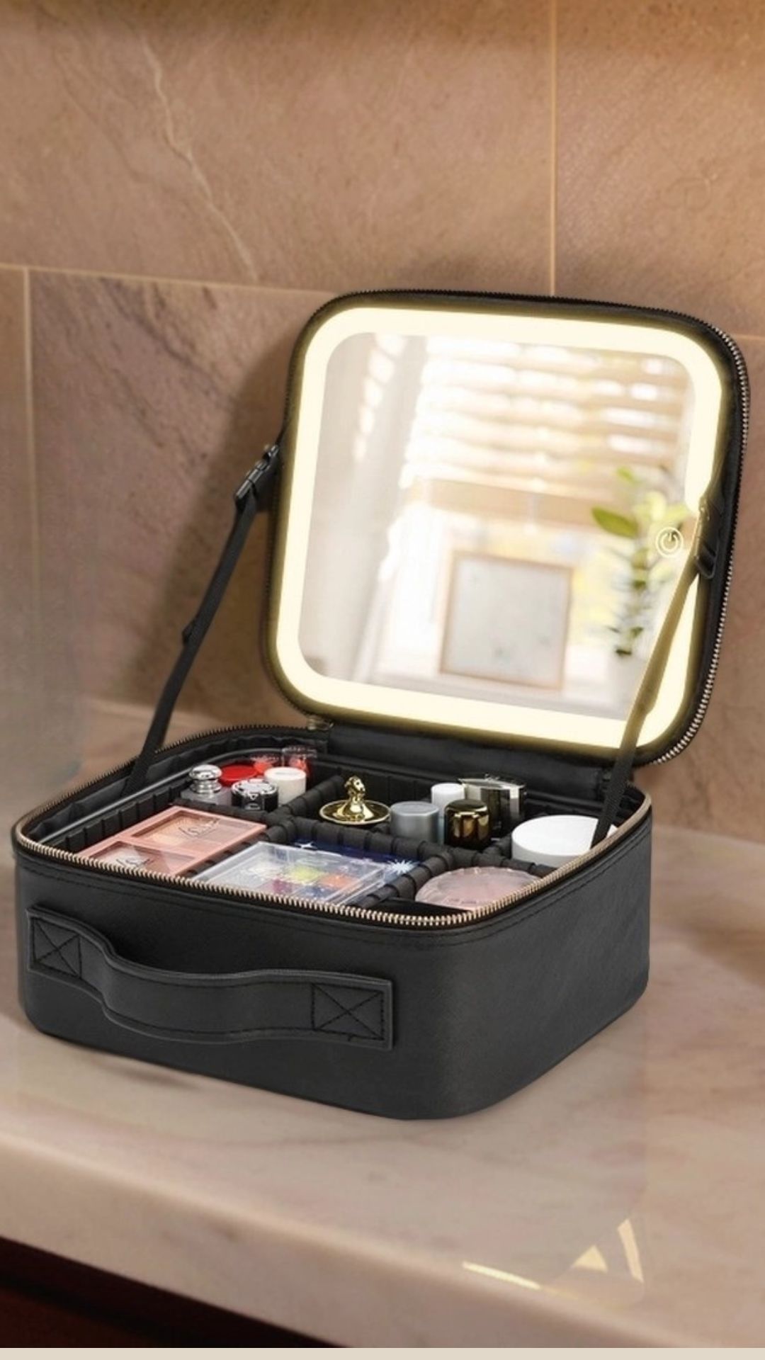 Мобильный и удобный органайзер для косметики имеет жесткий каркас, ручку для переноски, съемное зеркало с 3-мя режимамаи подсветки и сенсорным управлением. Подходит для хранения косметики и нанесения макияжа дома, в дороге, в гостиннице, на работе. Ваш туалетный столик теперь будет всегда с Вами.